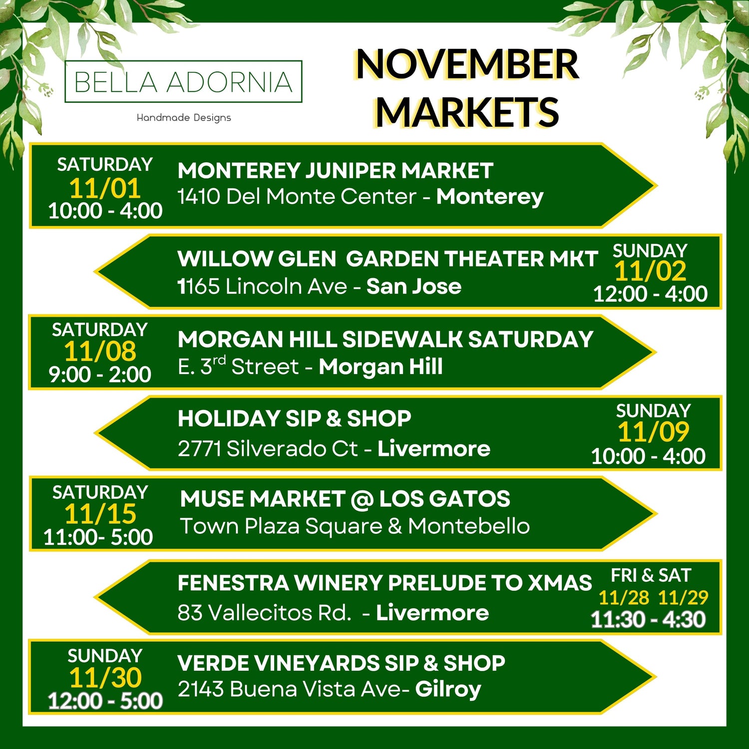 Check out Bella Adornia’s handcrafted jewelry in person! Visit our booth at upcoming markets in the Bay Area to Shop Live!