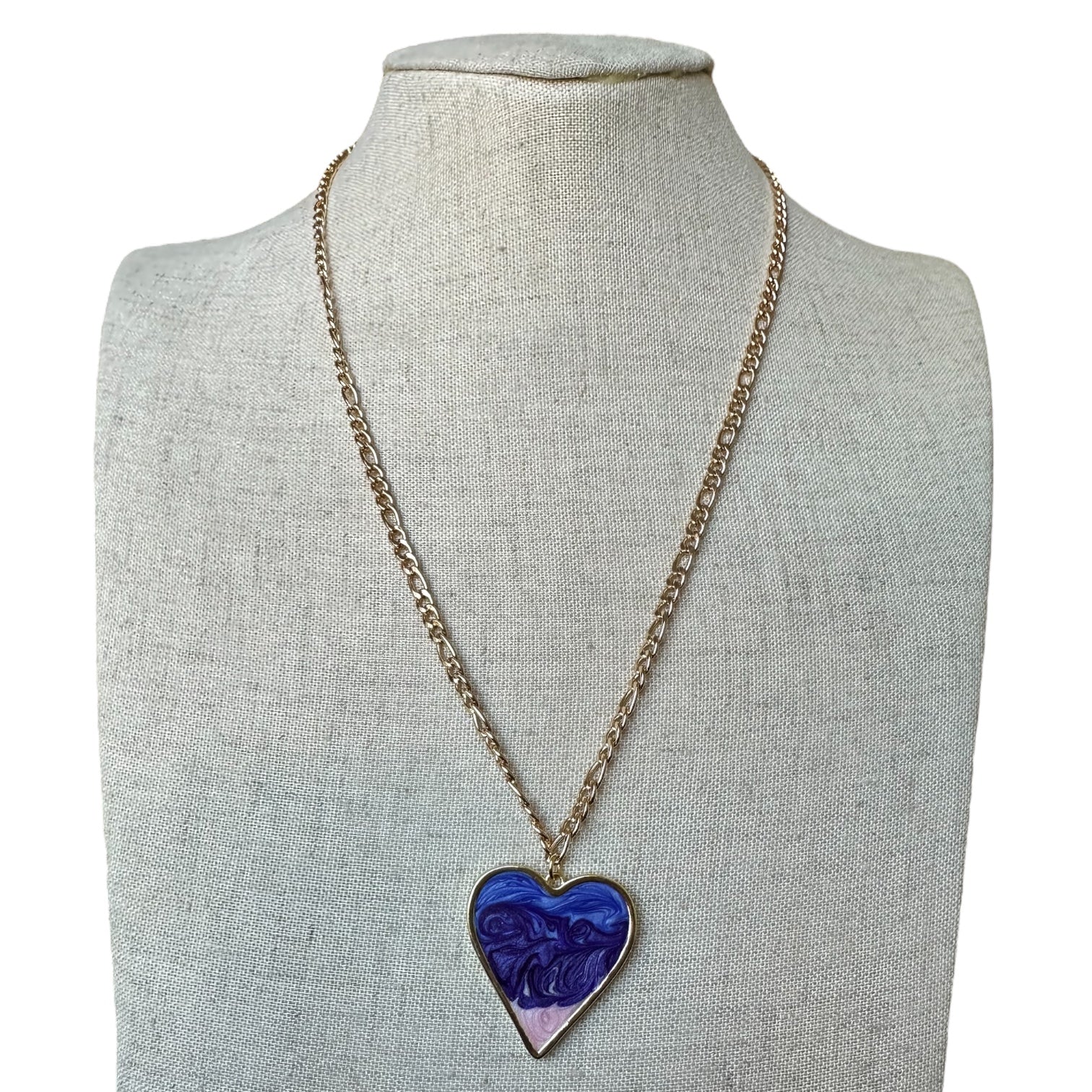 - Pendant: Heart-shaped design with a unique hand-poured resin in deep blue, violet, and blush swirls