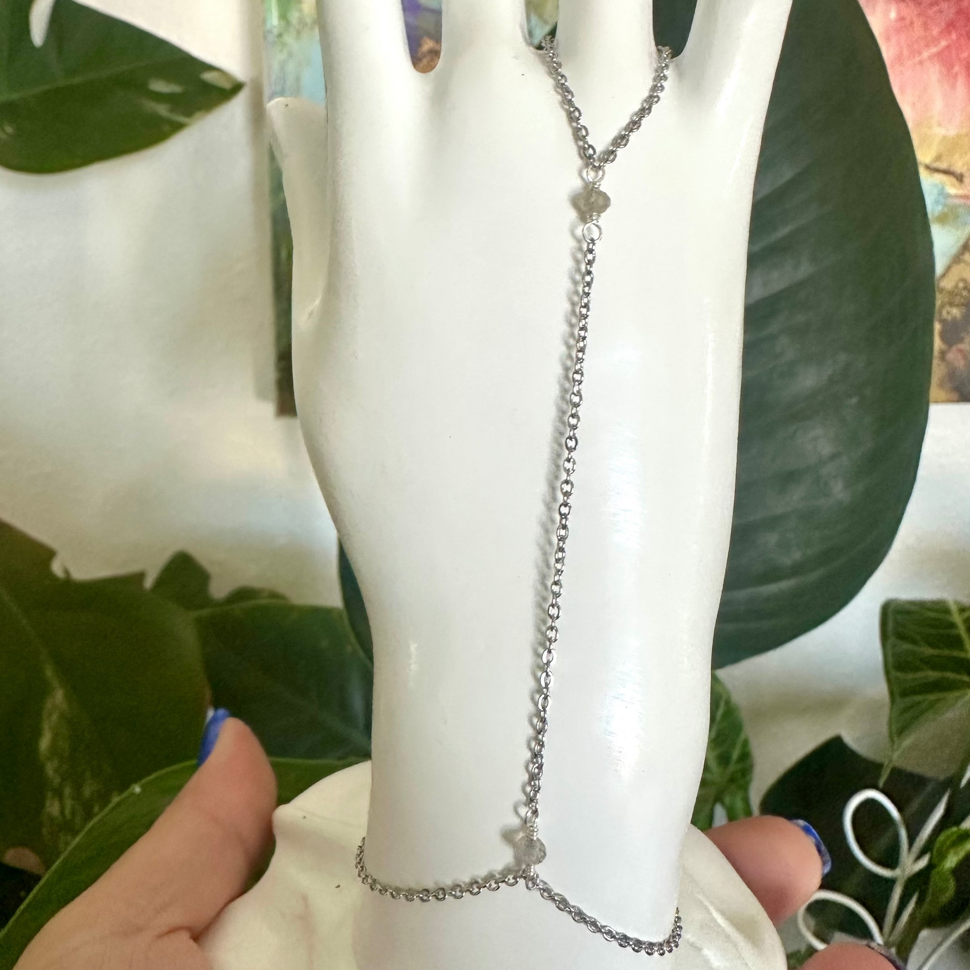 A dainty 1.5mm gold-finish stainless steel hand chain featuring 2mm gemstones — designed to add a touch of refined sparkle and meaning to your everyday look.
