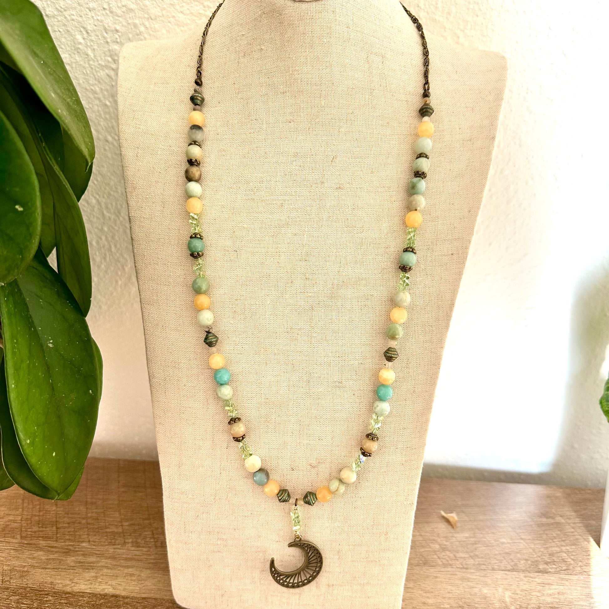 Embrace the magic of earth and moon with this captivating necklace. Featuring a crescent moon pendant, gemstones, and crystals, it combines natural beauty with celestial charm. Available in antique bronze or copper finishes.