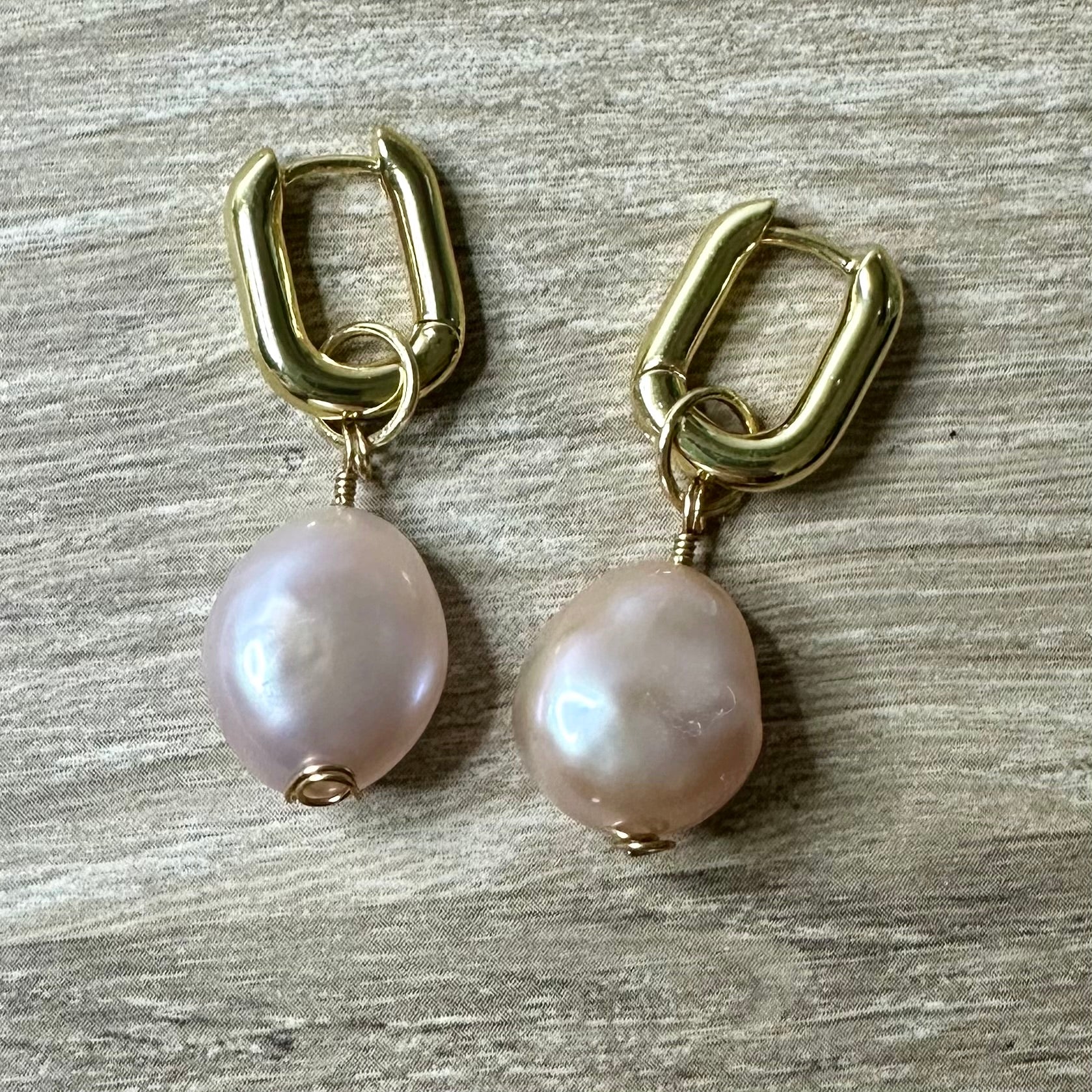 The Golden Tide Earrings are the perfect pairing to the necklace—or a beautiful standalone statement. Their natural charm and soft gleam make them versatile enough for daily elegance or dressy nights out. Designed to complement the Heirloom Nugget Pearl Necklace these drop earrings showcase the same radiant "nugget" pearls, suspended from delicate 14K gold-filled or stainless steel "huggie earrings. Lightweight yet eye-catching, they add effortless elegance to any look.