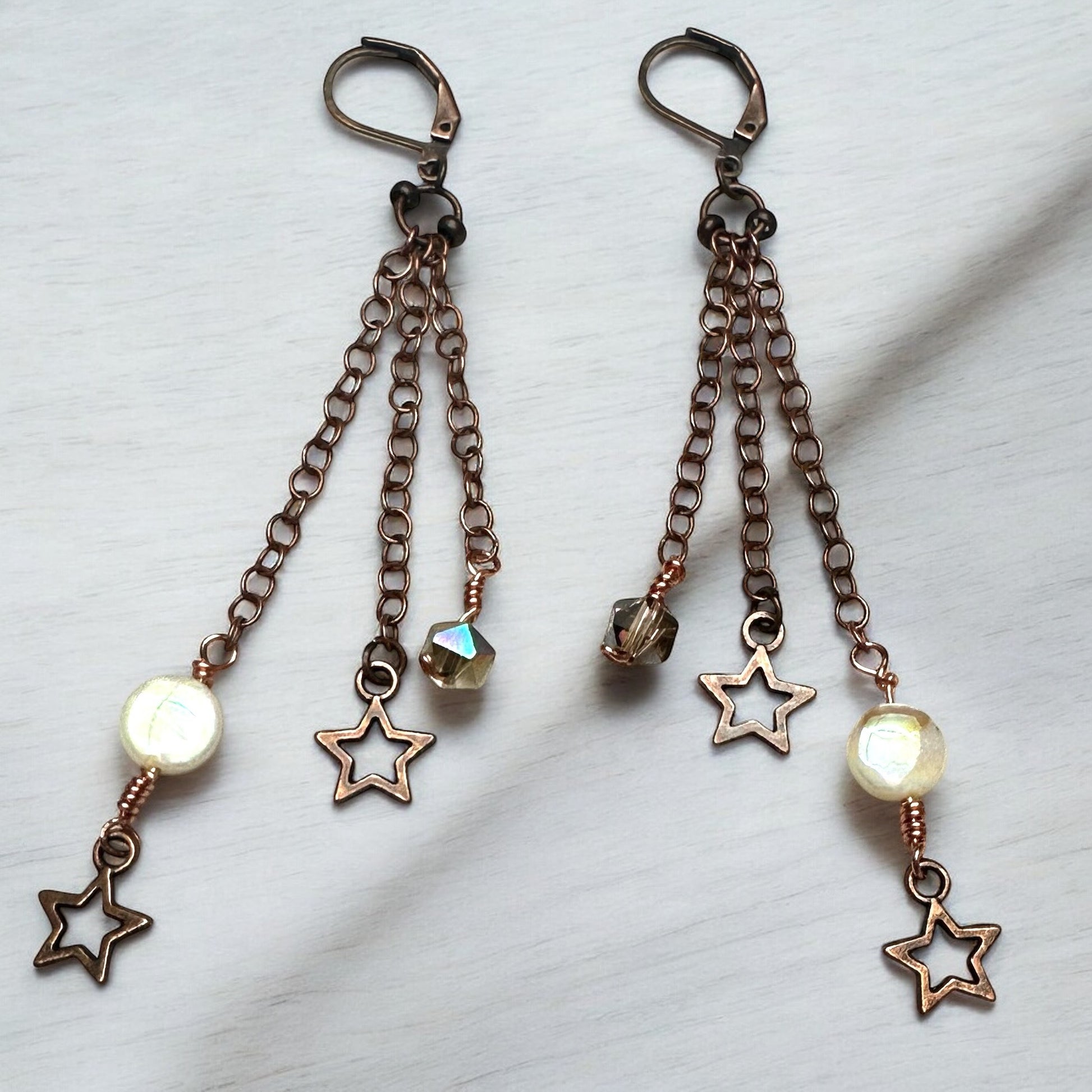 Add some starry charm to your jewelry collection with our Starry Night Earrings. These unique earrings feature star charms, shell beads and sparkling czech crystal beads on antique bronze chain. Perfect for adding a touch of whimsy to any outfit. (Night sky not included!)