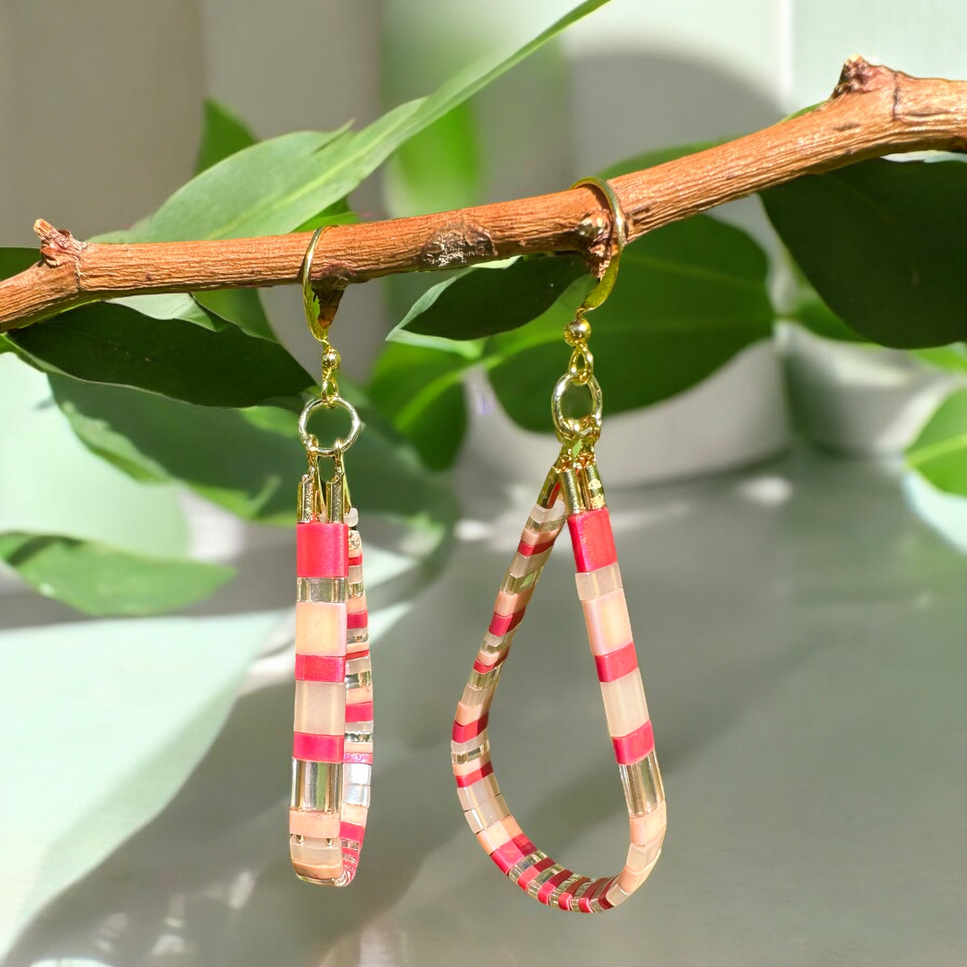 Elemental Teardrops - A stunning pair of handcrafted earrings made with premium glass Miyuki TILA beads. These elegant, bohemian earrings feature a vibrant mix of gold, green, and white tones that are sure to complement any outfit.
